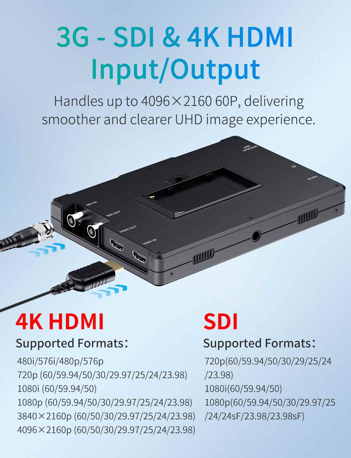 Equipped with 3G-SDI, 4K HDMI inputs and outputs, support up to 4096x2160/60p &3840x2160/60p signal, compatible with camcorder and the latest DSLR cameras on the market. And provide a 3.5mm headphone jack to monitor audio.